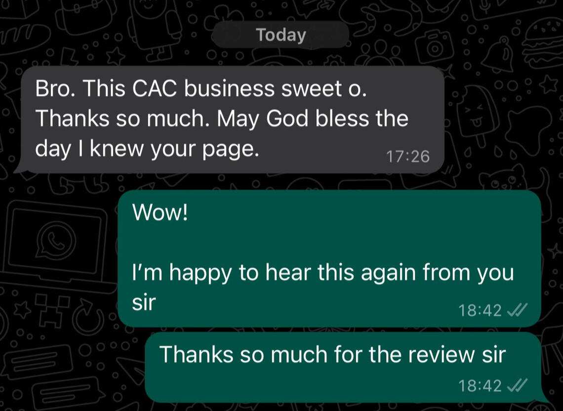 And together with my partners and team members, I have registered over 2,000 businesses, companies and NGOs. And I have trained over 350+ people on how to do the same and earn simultaneously.Let me tell you, CAC registration is the lowest key to make millions with no stress. Just you, your phone and internet connection, then you're good to go.Just apply for it now and see how profitable it is. Just give it a trial